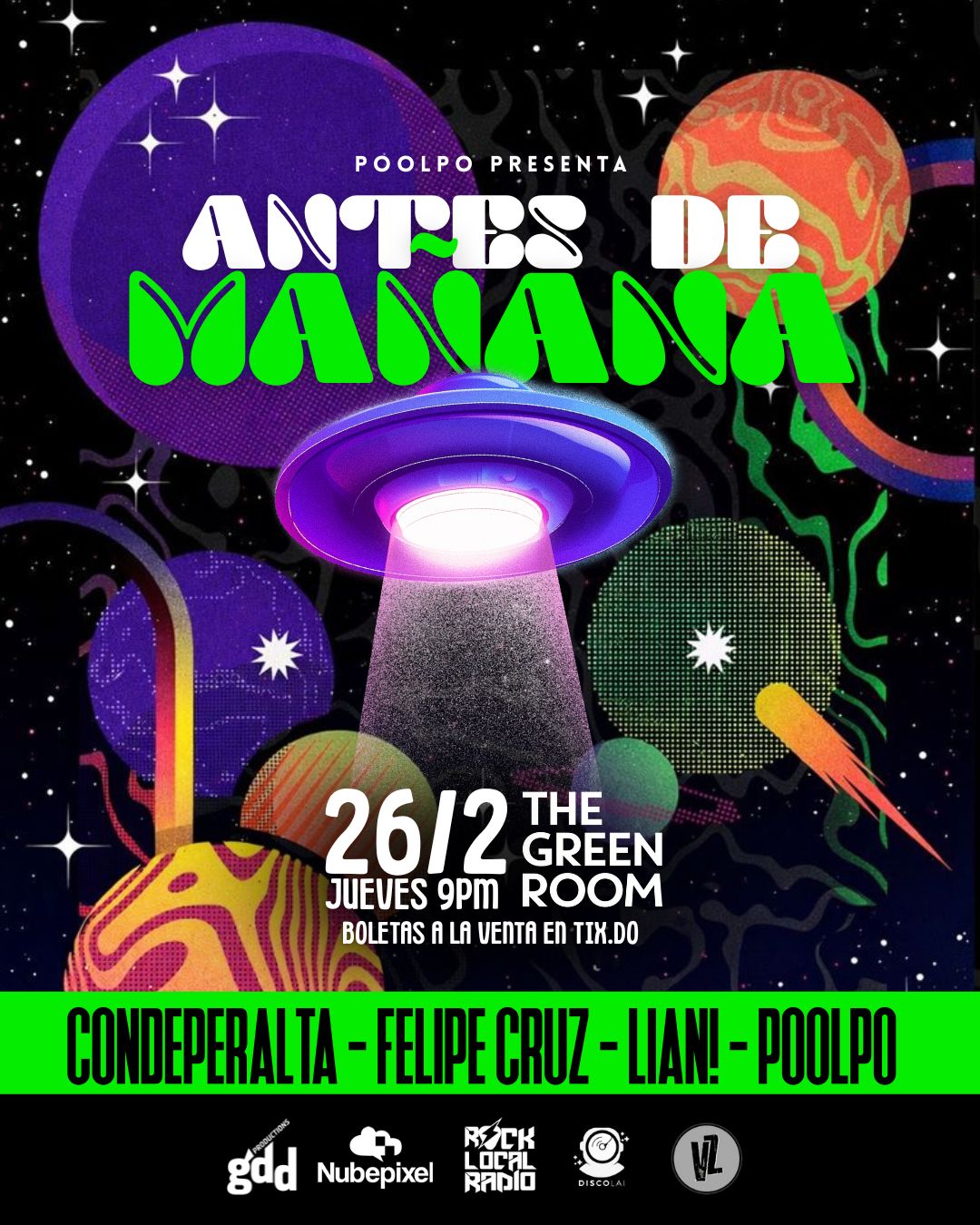 Santo Domingo, República Dominicana. — La banda dominicana Poolpo anuncia el concierto Antes de Mañana, un encuentro que reunirá distintas voces del rock local en una misma tarima. El evento se celebrará el 26 de febrero de 2026 en The Green Room, y contará con la participación de las bandas noveles: Condeperalta, Lian! y Felipe Cruz.
